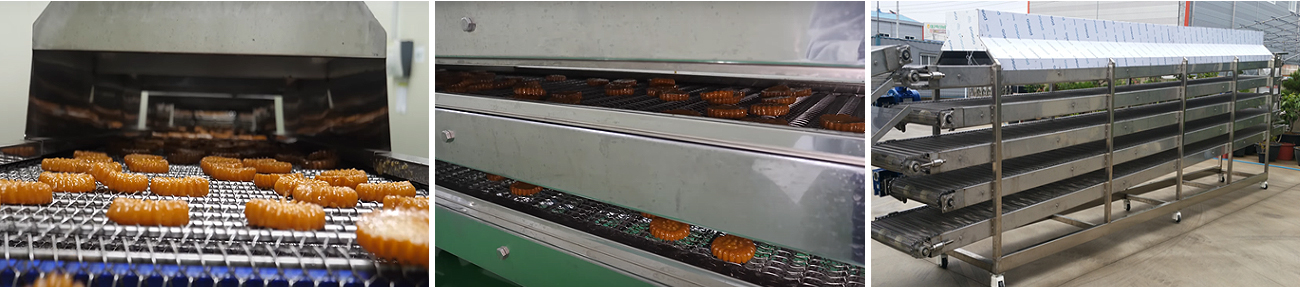 시럽 코팅된 약과를 팬이 달린 컨베이어를 통과시키며 열기를 식히고 표면에 묻은 유탕유와 물엿을 털어주는 역할을 하는 장치입니다.